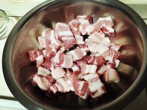 打开高压锅 去掉杂质 将猪五花切块 开火熬制汤汁浓稠 猪肉绵软