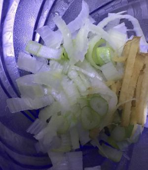 五花肉糖色均匀后加入料酒,酱油,切好的葱花姜丝小火炒香。