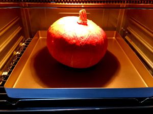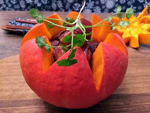 将红烧肉装入南瓜中,盖上盖子,放烤箱110度蒸汽蒸30分钟