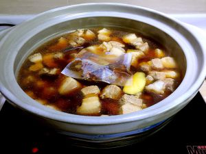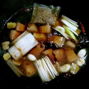 然后加入热水(一定不能加凉水哦,炒过的肉,受热后如果加入凉水肉会突然收缩,烧出来的肉就发死,不会软糯了)和炖肉料包和味极鲜酱油2勺,大火烧开后转中火炖煮40分钟后加入适量的盐和鸡精,再炖煮15分钟左右,大火收汁即可。