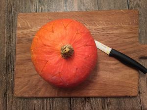 肉炖在那里,我们来给南瓜切花,先用快刀划出花型