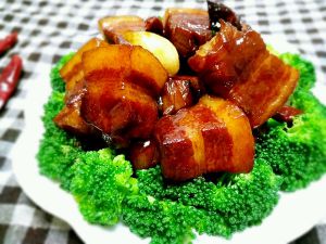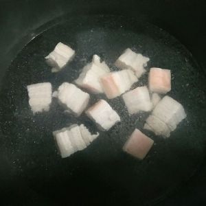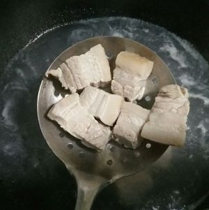 将浸泡好的五花肉过开水焯一下,去血水和浮沫(此步骤不可省,否则影响口感和肉的色泽)