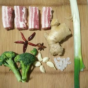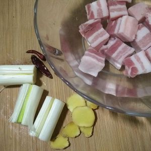 五花肉切2.5厘米左右见方块,加2勺料酒和适量清水浸泡15分钟,葱切段,姜切片。