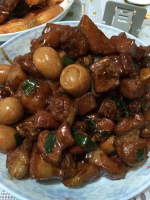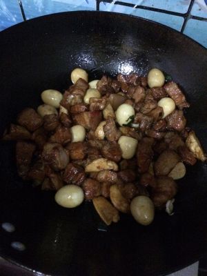 大火锅烘热加油改小火,加入调料勺5小勺白糖,炒勺快速搅拌至糖完全化开,熬出沫立刻加入五花肉改大火翻炒、加蒜片部分葱段、厨邦老抽、一勺半盐、十三香一点、继续翻炒、加准备好的鱼丸、鹌鹑蛋、炒匀加水、离锅3厘米水高、大火炖水开改小火炖40分钟(根据加水量决定炖时间、加水越多炖时间长肉越嫩)汤变少大火收汤、放葱花、关火、出锅。