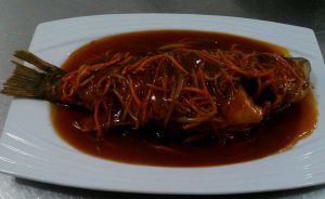 锅内放姜,加醋、糖、番茄酱、盐和湿淀粉,沿一个方向搅动成汁;将汁淋在鱼上即可。