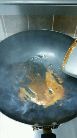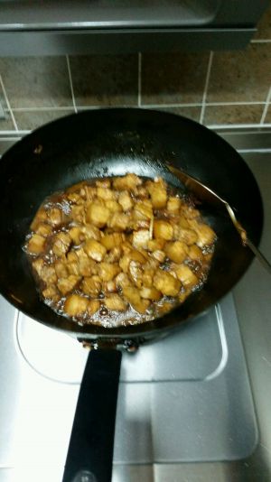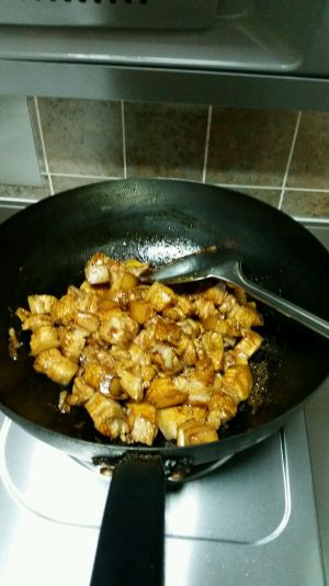 铸铁锅加热1分钟左右,舀一大勺白砂糖炒化,五花肉切粒在热水里焯一下,沥干水份倒入铸铁锅里上糖色。