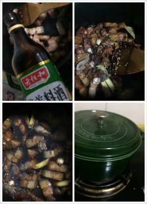 然后加入料酒、生抽、老抽、香料、花椒、干辣椒、姜片,加一碗水拌匀,盖上盖上汽后改小火烧制20分钟。