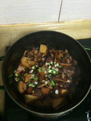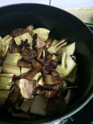 最后将春笋、香菇加入肉里,放点盐拌匀继续小火烧制20分钟。