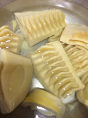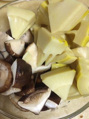 先将春笋切大块用热色汆烫一下,然后用清水浸泡半天,为了去除口涩感。