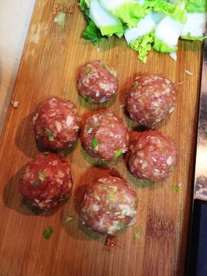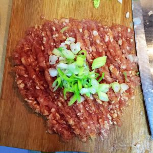 把肉切成片,再切成丁,开始剁,剁的时间应该久一点,这样肉才会吃起来口感细腻,加入细盐、酱油、葱花,再剁一下