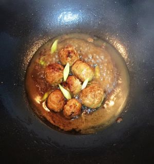 2.锅中放肉炒红,倒味极鲜,倒水,放葱姜,放三勺糖