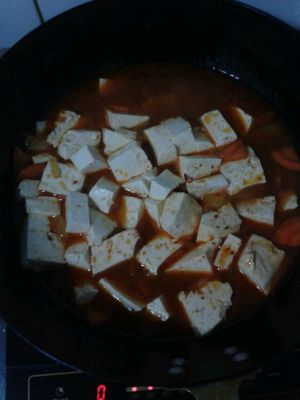 锅里倒上油七八分热葱蒜爆香,加入豆瓣酱炒匀,放入豆腐再加上高汤(没有高汤清水也可)