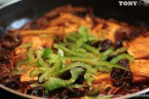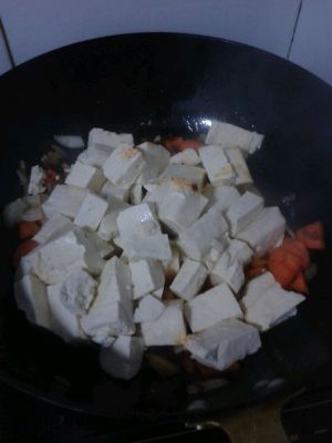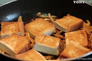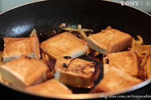 香姜锅中放油烧至六成热,爆、蒜,放入煎好的豆腐块,翻炒均匀。