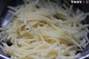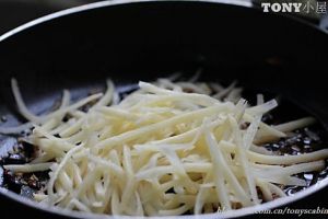 加入青椒丝。开始掂锅,让食材充分吸收汤汁到快收干。