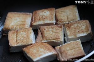 锅中放一点油,把豆腐煎到两面金黄后拿出备用。