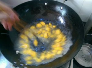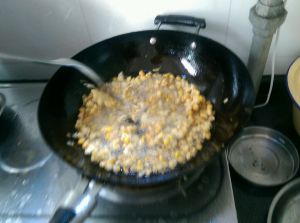 在超市买成包的玉米粒,用淀粉和水抓起来,热油,炸一下