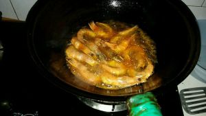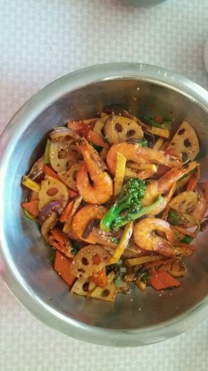 (忘记拍了)配料炒香后转中大火,放虾,翻炒,加料酒