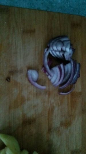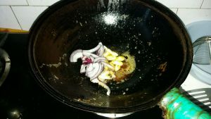 葱姜蒜下锅煸炒出香味,我不喜欢吃葱所以用小洋葱头代替。