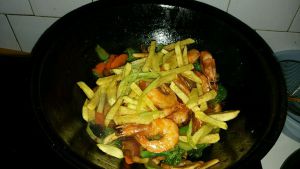 倒出多余的油,锅内剩适量的油,小火烧油,放入姜,干辣椒断炒出香味,开大火,放葱白,翻炒一下,再放蒜尾,最后放入虾和土豆,炒均匀,撒盐,炒均匀,倒入酱油,翻炒几下,熄火,出锅!