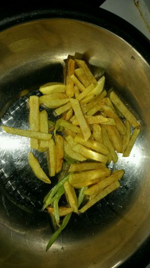 虾皮炸通透时就可捞起备用,放入土豆,炸软,备用。