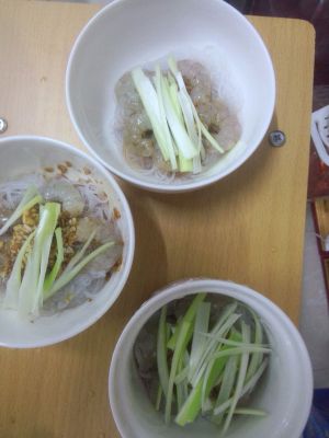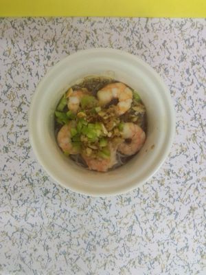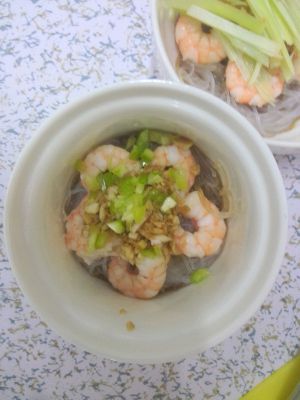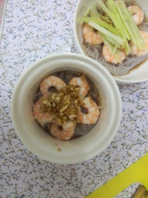 先将虾,去虾线,去皮。 将蒜切碎,放入些味极鲜。 粉丝用热水烫8分钟。 先把粉丝摆如小碗中,然后将五个虾依次放入,成花瓣状,在中间放入调好的蒜末,和葱丝
