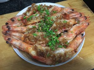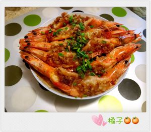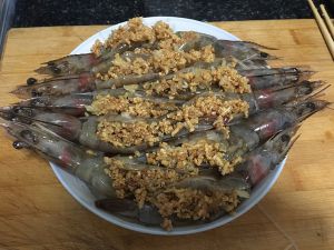 热锅放油,下蒜蓉炒香,放适量生抽,蚝油,盐(经验所得,这步需加适量清水),炒好的蒜蓉铺在虾上面