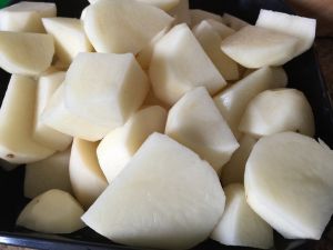 猪肉、土豆、洋葱分别切成大小相等的块儿,多剥几颗大蒜。