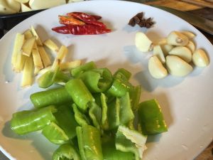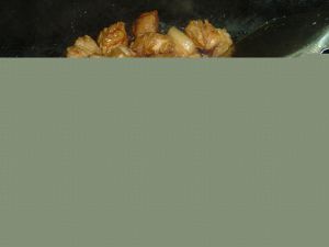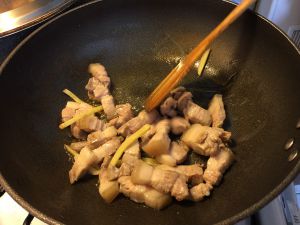 锅内留少许油,放入葱段、姜块,煸出香味,投入肉块,肉块炒出油时,放入酱油、料酒,不断翻炒,使其上色。