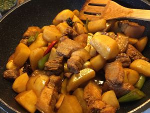 五花肉上色后加入土豆块、辣椒,盐爆炒,不加水。用锅盖焖爆炒会,记得翻炒。差不多以后倒入开水盖过土豆和肉。然后小火炖炖。因为妹妹想要粘稠的汤汁所以加了生粉。大概炖20分钟,多炖一会,大火收汁就可以了。很好吃。可以少点冰糖。