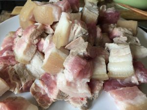 冷水放入姜片,料酒,然后放入整条五花肉烧开,关火。切块