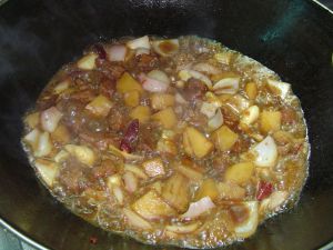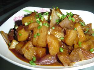 再加入少许水,用大火烧开,小火焖至近烂,投入土豆块、白糖,再烧10分钟,待土豆入味时,起锅盛入碗中即可。