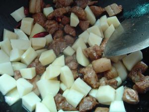 油烧热放辣椒段,花椒,蒜末爆香入肉肉超白加红烧酱油炒致上色下土豆炒两分钟加高汤或清水顿30分钟。