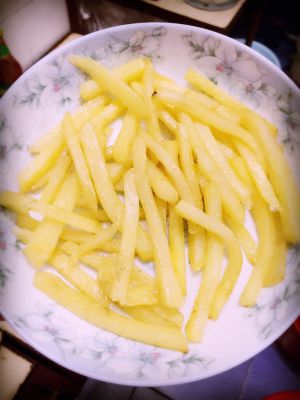 我这是冻了一晚 拿出来凉一会 稍松动一些就可以炸了 油多放 待油七分热时再放薯条 千万别太热了炸 否则薯条容易糊 发黑的