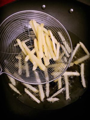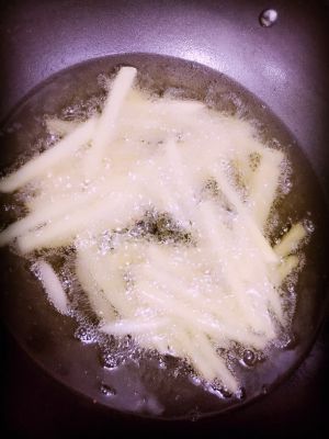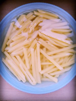土豆切条,过几次水,在从冰箱冰半个小时,炸前再厨房纸上吸干水分
