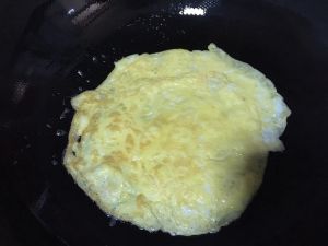 锅中加油,将打散的鸡蛋摊成薄饼,煎熟后倒出备用。
