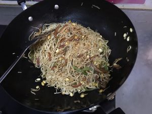 加入炒面翻炒,使炒面均匀略上酱油色后,出锅。
