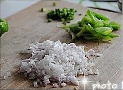 洋葱切小块,青椒切丝,蒜薹切末备用。