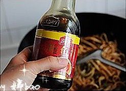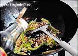 虾干出香味儿后放入切好的青椒丝炒软,烹入海天金标生抽,加少许水。