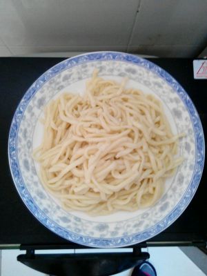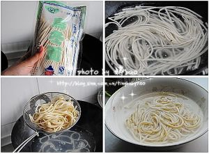 煮好的面条过一下凉水(这样面条就不会粘连),沥干水份待用。