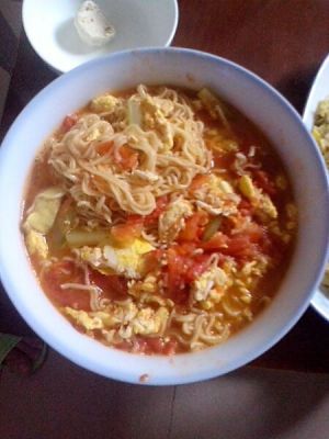面饼在滚水里煮熟捞上来放进刚煮好的的西红柿汤里就好了。