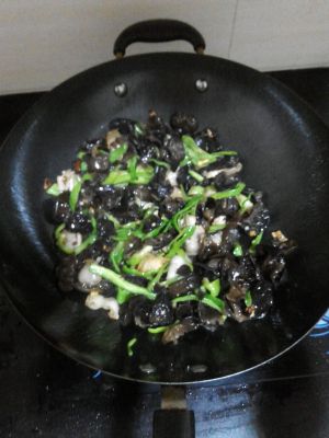 肉炒到适当时将木耳与青椒丝倒入,并放入少量酱油,要多翻炒。木耳会蹦要小心点。加入盐、味精出锅就好了