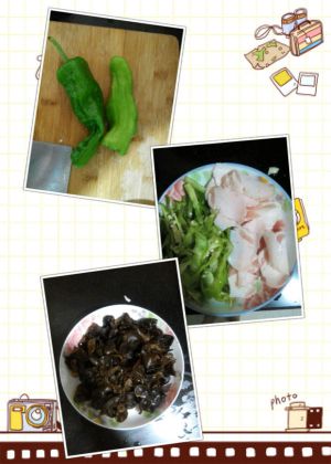 青椒切成丝,五花肉切的薄些,木耳泡开并撕开。准备好大蒜与生姜沫