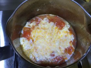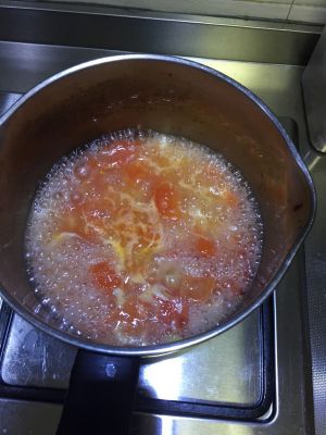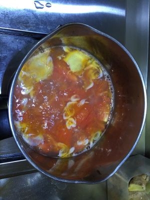 等西红柿软了之后加入鸡蛋翻炒一下,加了一点水,煮一下,落盐鸡精少许,最后我加了几滴醋