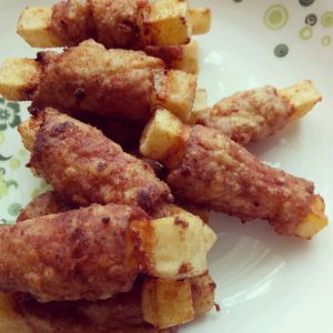 炸好的里脊卷土豆放入锅内翻炒,加水,闷三分钟,出锅!ok!