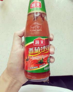 用番茄酱大火热油炒蒜泥,加盐,加白醋,加白糖