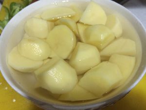 土豆,尖椒,洋葱切块。土豆放水中去淀粉