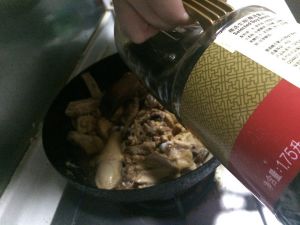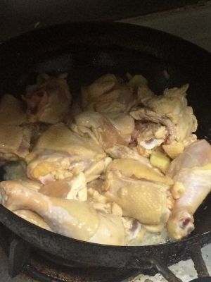 倒入姜、葱、蒜瓣和鸡肉,翻炒均匀。