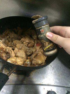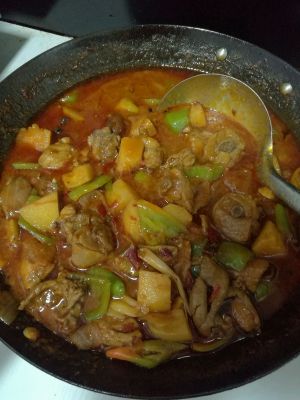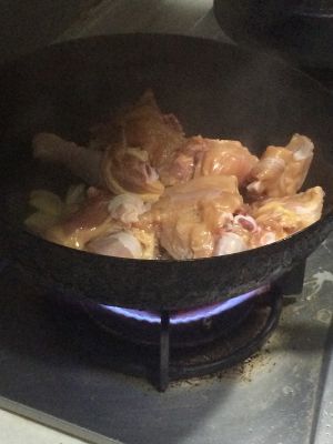 炒锅加油,油量比平时炒菜稍多点。冷油加糖,炒至冒黄泡,迅速倒入鸡块,同时盖上锅盖以防溅起的油伤手。鸡块炒上色,加入番茄汁翻炒。再倒入洋葱翻炒。