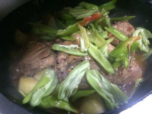8分钟后打开锅盖加入螺丝椒 洋葱炒均匀,继续焖煮收汁,这时提醒一下各位~加了螺丝椒和洋葱后不需要加锅盖,就打开锅盖收汁就好,因为加了锅盖青椒会变色,影响出锅美观,收汁差不多(不需要完全收干汤汁)就可以出锅啦
