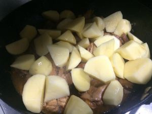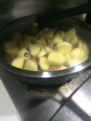 加水和土豆,直至水基本没过鸡肉,大火烧开后盖盖子中小火二十分钟,到土豆差不多软了即可
